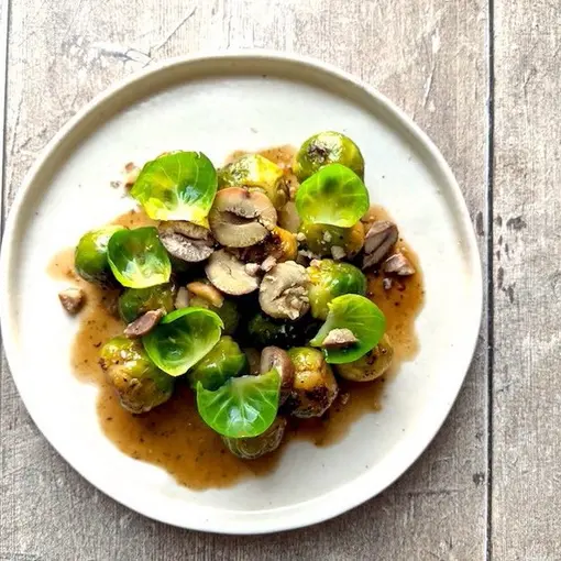 Finally, cook the sprout leaves in the boiling water for 30 seconds or so, until tender. Roughly chop or slice the chestnuts. To serve, place the braised sprouts in a serving dish and spoon the sauce over. Garnish with the chestnuts and sprout leaves.